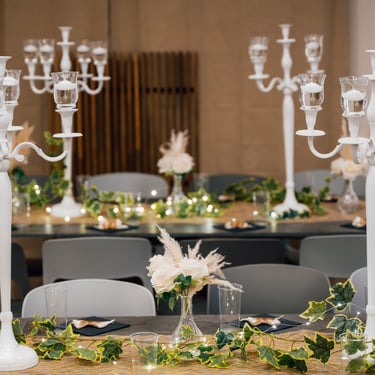 Un dettaglio scenografico dal fascino intramontabile: i candelabri bianchi a cinque bracci con candele a LED illuminano gli spazi con una luce calda e soffusa, creando un’atmosfera romantica e raffinata. Il loro design classico ed elegante li rende protagonisti ideali per matrimoni, gala ed eventi esclusivi, dove ogni tavolo si trasforma in un piccolo angolo di luce e bellezza. Perfetti come centrotavola o elementi decorativi, donano un tocco di magia e armonia ad ogni allestimento, esaltando con semplicità la raffinatezza dell’evento.