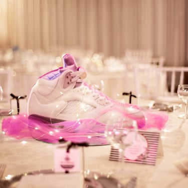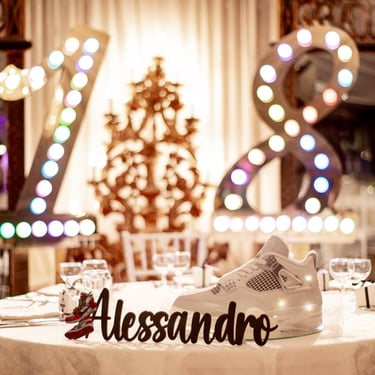Decorazione in polistirolo stampato con profili glitterati su base a specchio, toulle e luci: un centrotavola scenografico e leggero, ideale per eventi dallo stile brillante e personalizzato