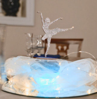 Ballerina in pioppo glitterato su base rotante: toulle, luci e specchi creano un centrotavola elegante e sognante, perfetto per eventi romantici.