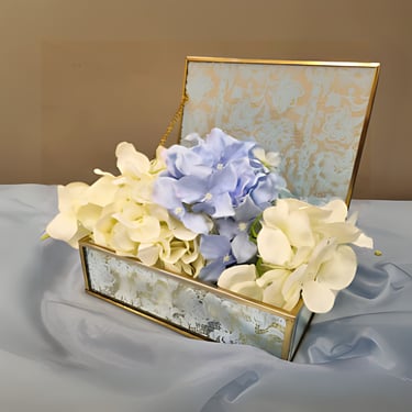 Scrigno azzurro e oro con fiori all’interno: un centrotavola fiabesco e prezioso, ideale per eventi romantici dal tocco regale