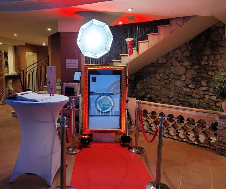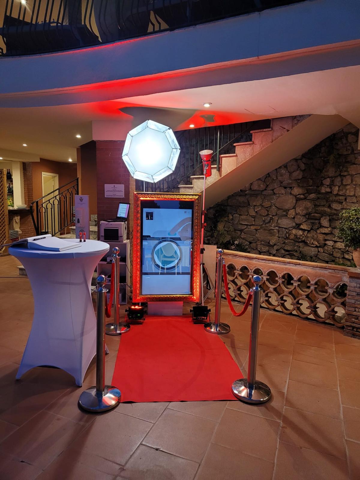 An evolution of the classic photo booth: the magic mirror is interactive, fun and highly scenographic. Guests can take photos, personalize them with messages and frames, and receive them immediately as a souvenir.