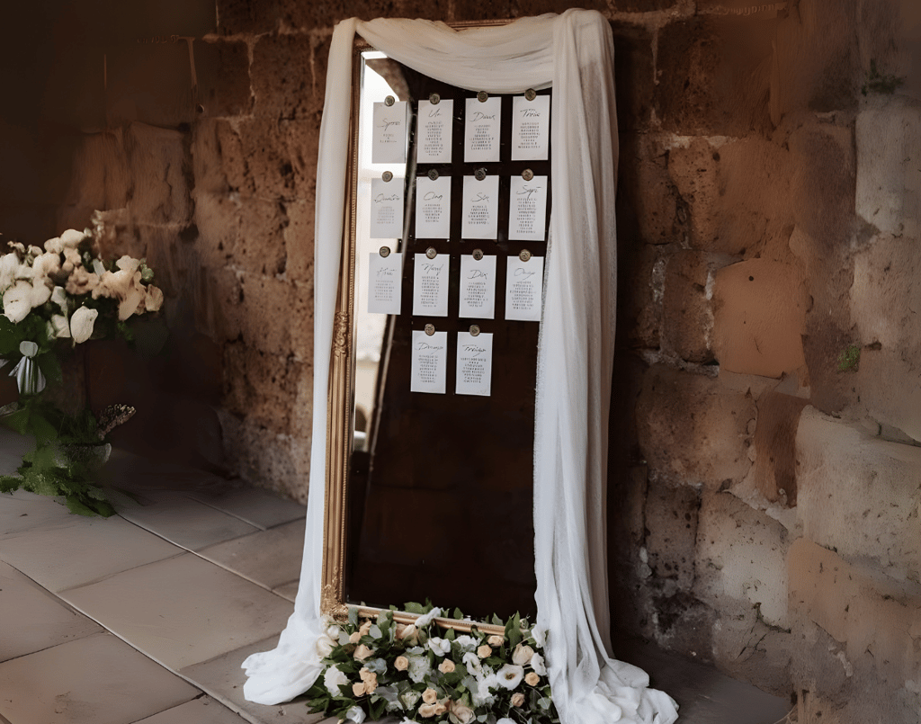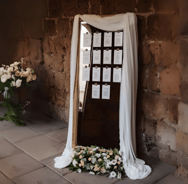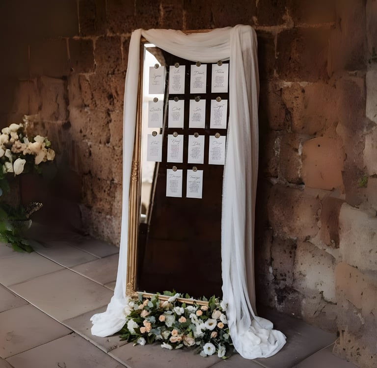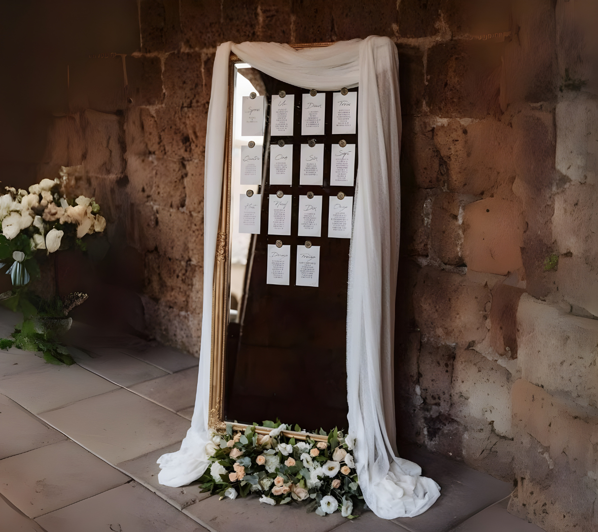 ✨ Plus: ogni specchio viene scelto e decorato in armonia con lo stile dell’evento, diventando un elegante punto scenografico d’ingresso.